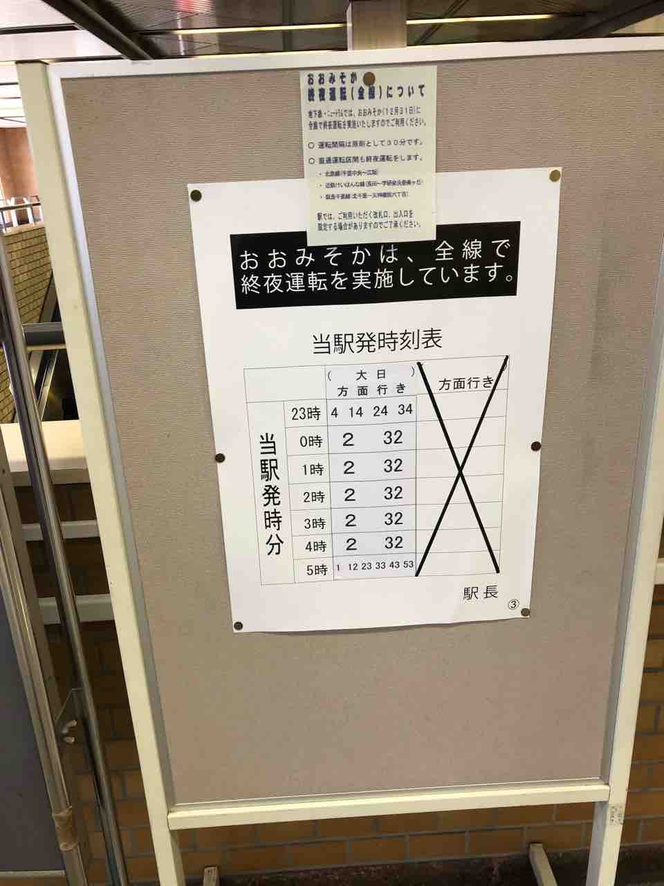 ことくらいだと思います。画像は今日大阪メトロ八尾南駅にて撮影した今年の大晦日の終夜運転の時刻表です。時刻表の上に掲示されているのは、終夜運転のお知らせの掲示物です。大阪メトロ谷町線では通常の終電後に0時台から4時台にかけて30分間隔で大日駅〜八尾南駅間で運行されるようです。詳しくは大阪メトロのホームページ内の記事(https://subway.osakametro.co.jp/guide/relief_service/subway/20191201_nenmatsunenshi.php)