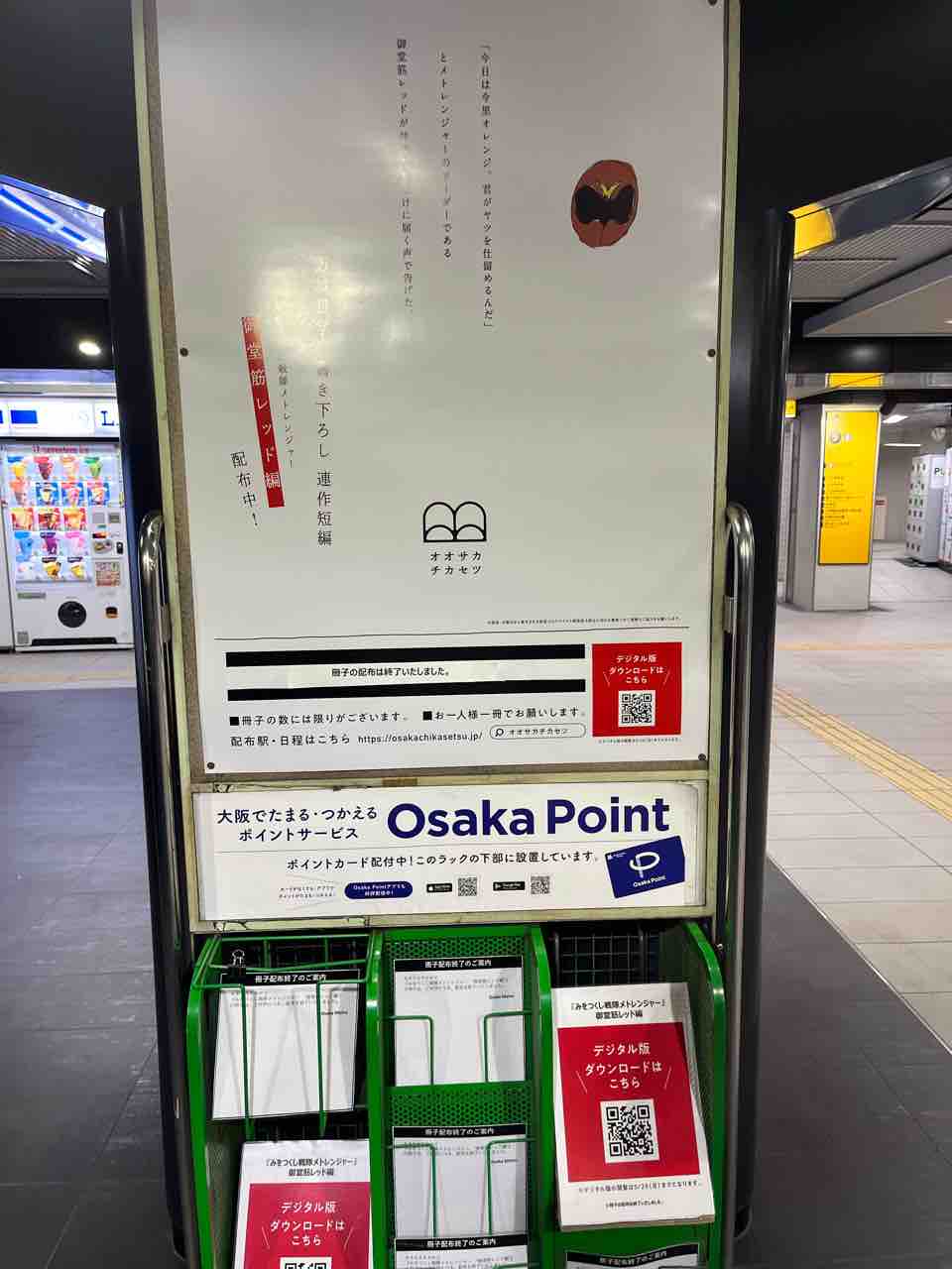 で読むことができます。発行部数が限られているため利用客の多い駅では早めに無くなります。わざわざ大阪メトロの駅で入手しなくても特設サイトでPDF版が読めますので、貰い損ねた方はそちらでお読みください。因みに画像は先月26日の朝の大阪メトロ御堂筋線中津駅南改札外の『オオサカチカセツ』ラックです。