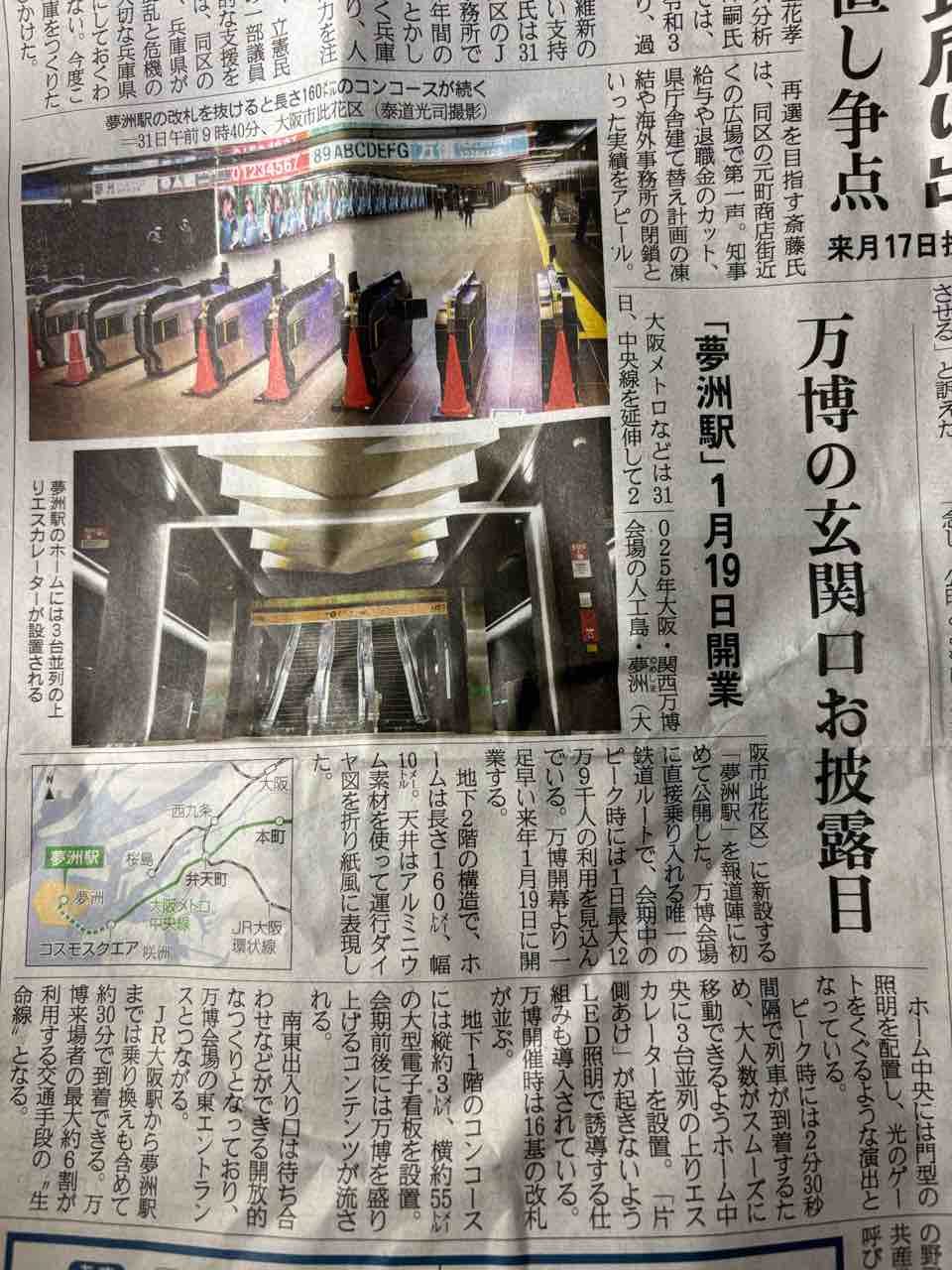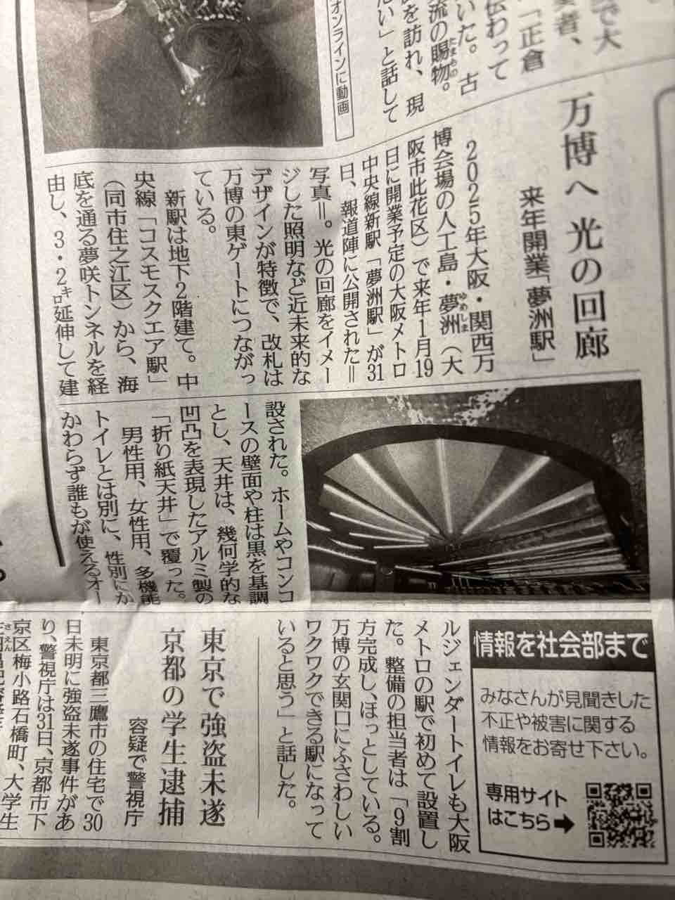 今日の産経新聞と読売新聞の夕刊に来年1月19日開業予定の大阪メトロ中央線の新駅の『夢洲(ゆめしま)駅』が報道陣に公開されたという記事が載っていました。夢洲駅は、◎路線=大阪メトロ中央線◎構造=地下駅、改札コンコースが地下1階でホームが地下2階◎可動式ホーム柵=あり(黒い可動式ホーム柵設置)◎ホーム構造=島式ホーム1面2線◎開業予定=2025年(令和7年)1月19日となるようです。因みに画像は今日(2024年(令和6年)10月31日)付け産経新聞夕刊の1面と読売新聞の夕刊の8面に載った夢洲駅に関する記事です。iPhoneからの投稿