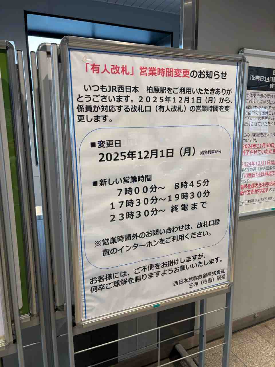 柏原駅の有人改札の営業時間が変更になります! 2025年11月13日 柏原駅(JR西日本=https://eki.jr-odekake.net/top?id=0620822、近畿日本鉄道=https://www.kintetsu.co.jp/station/station_info/station14007.html)の『有人改札』の営業時間が変更になります。【変更駅】柏原駅(大阪府柏原市上市(かみいち))【変更日】2025年12月1日【新営業時間】◎7:00〜8:45◎17:30〜19:30◎23:30〜終電に変更になります。柏原駅をご利用の方はご注意ください。iPhoneからの投稿 カテゴリなしの他の記事 < 前の記事次の記事 > コメント コメントフォーム 名前 コメント 記事の評価 リセット リセット 顔 星 情報を記憶 コメントを投稿する